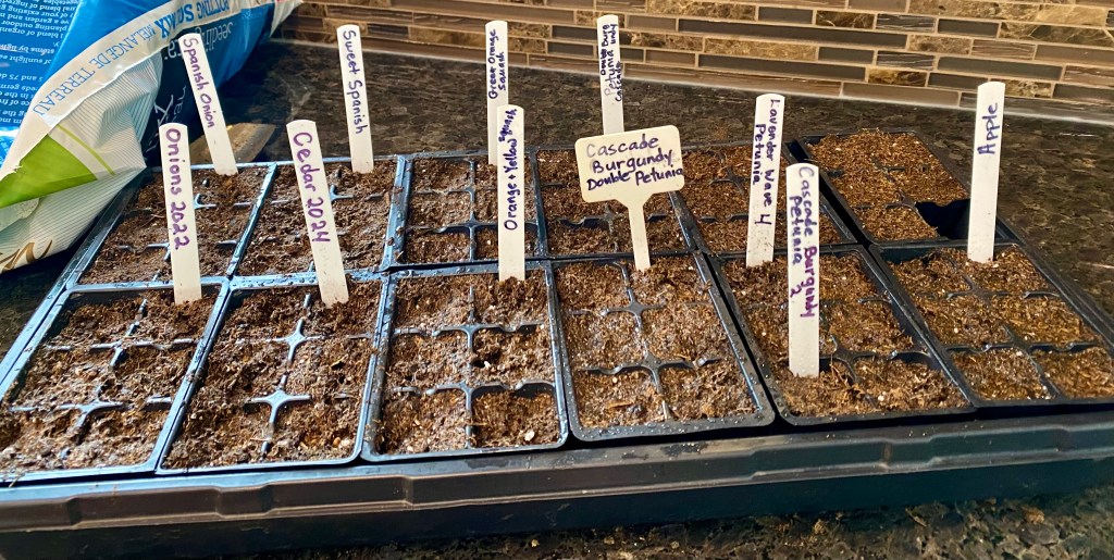 - Petunia Cascade Blue – These seeds are supposed to be good till December 2025 however they were looking rather dry and I planted all the seeds in 4 cells.