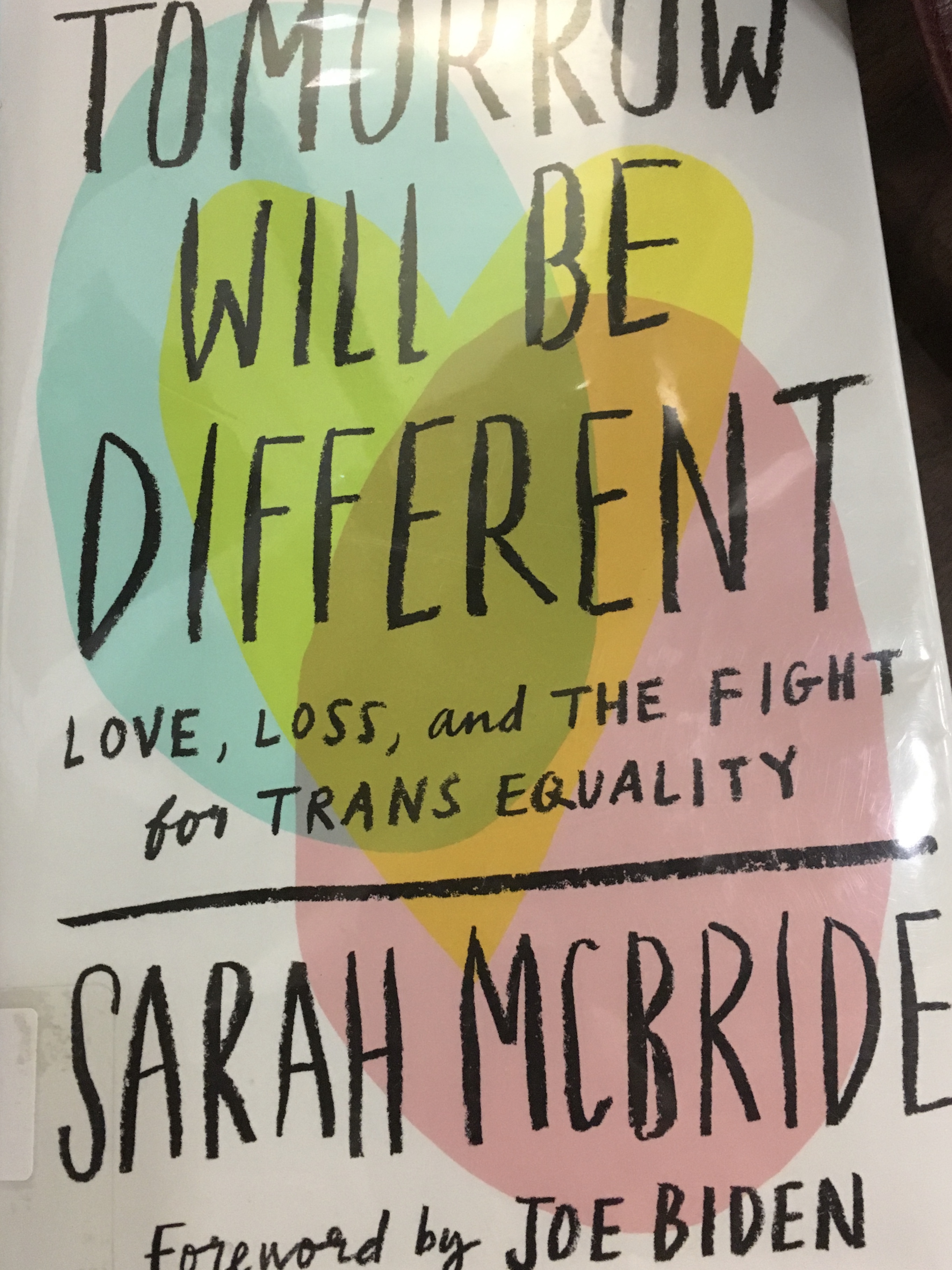 Tomorrow Will be Different, Love, Loss and the Fight for Trans Equality by Sarah McBride. This memoir, tells Sarah’s story of coming out, her activism, her marriage, and the death of her husband a short time later. Her honesty about her life and her willingness to fight for change inspires me. She is currently the National Press Secretary of the Human Rights Campaign in the United States. Another challenging and hopeful read.